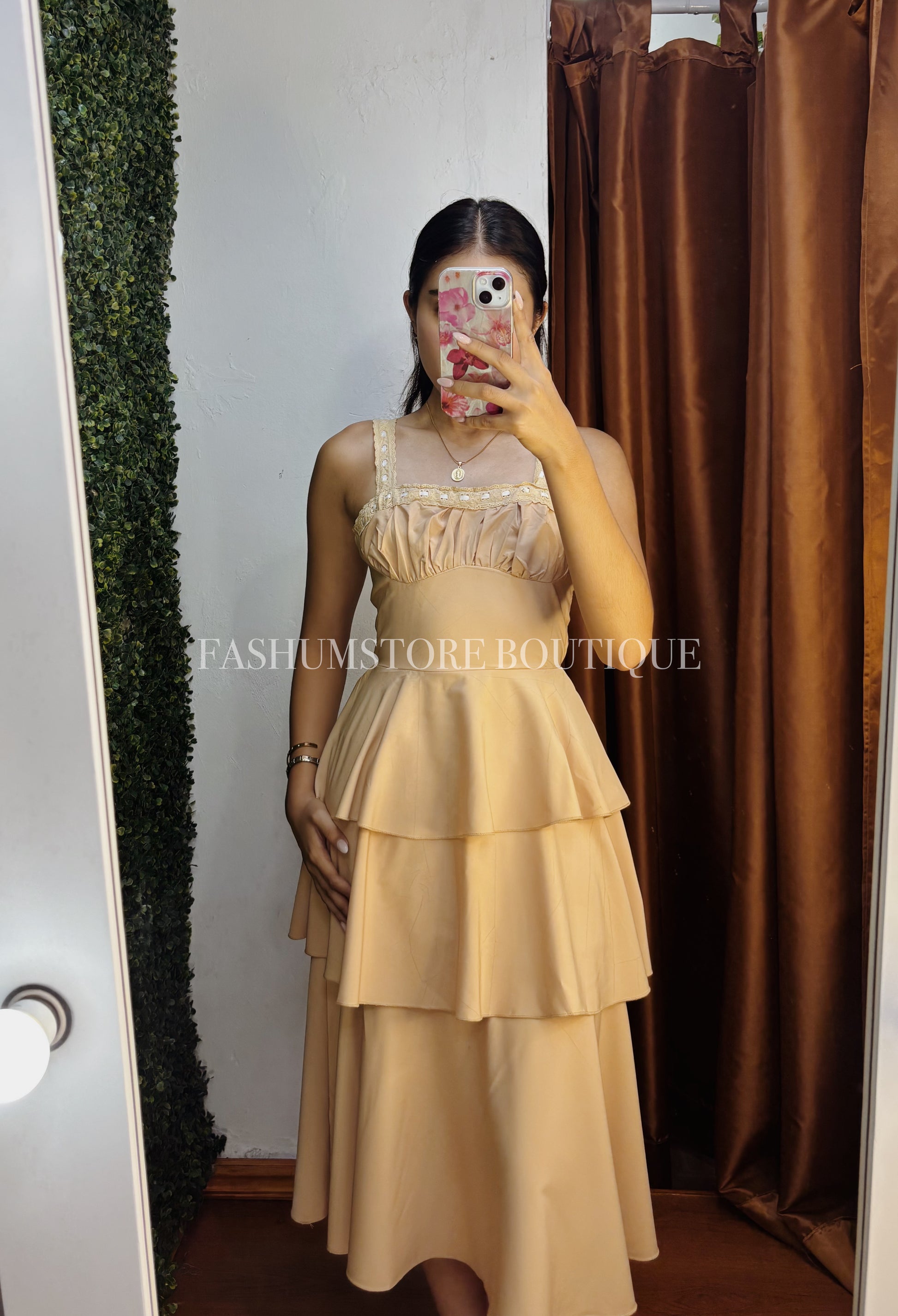 "Este elegante vestido beige está adornado con hermosos olanes que le dan un toque femenino y sofisticado. Además, cuenta con una banda en la parte posterior que permite ajustarlo y crear un hermoso moño. Perfecto para lucir elegante y a la moda en cualquier ocasión."